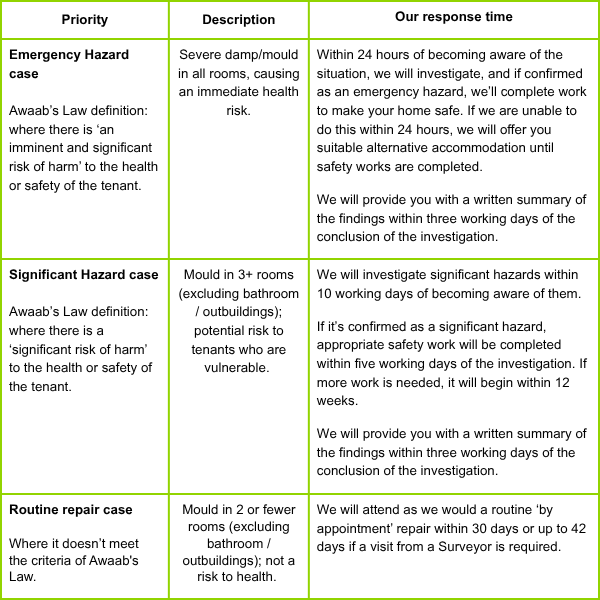 This information is part of our overall response to damp and mould. You can read more about how we identify and resolve issues in our Damp, Mould and Condensation Policy.